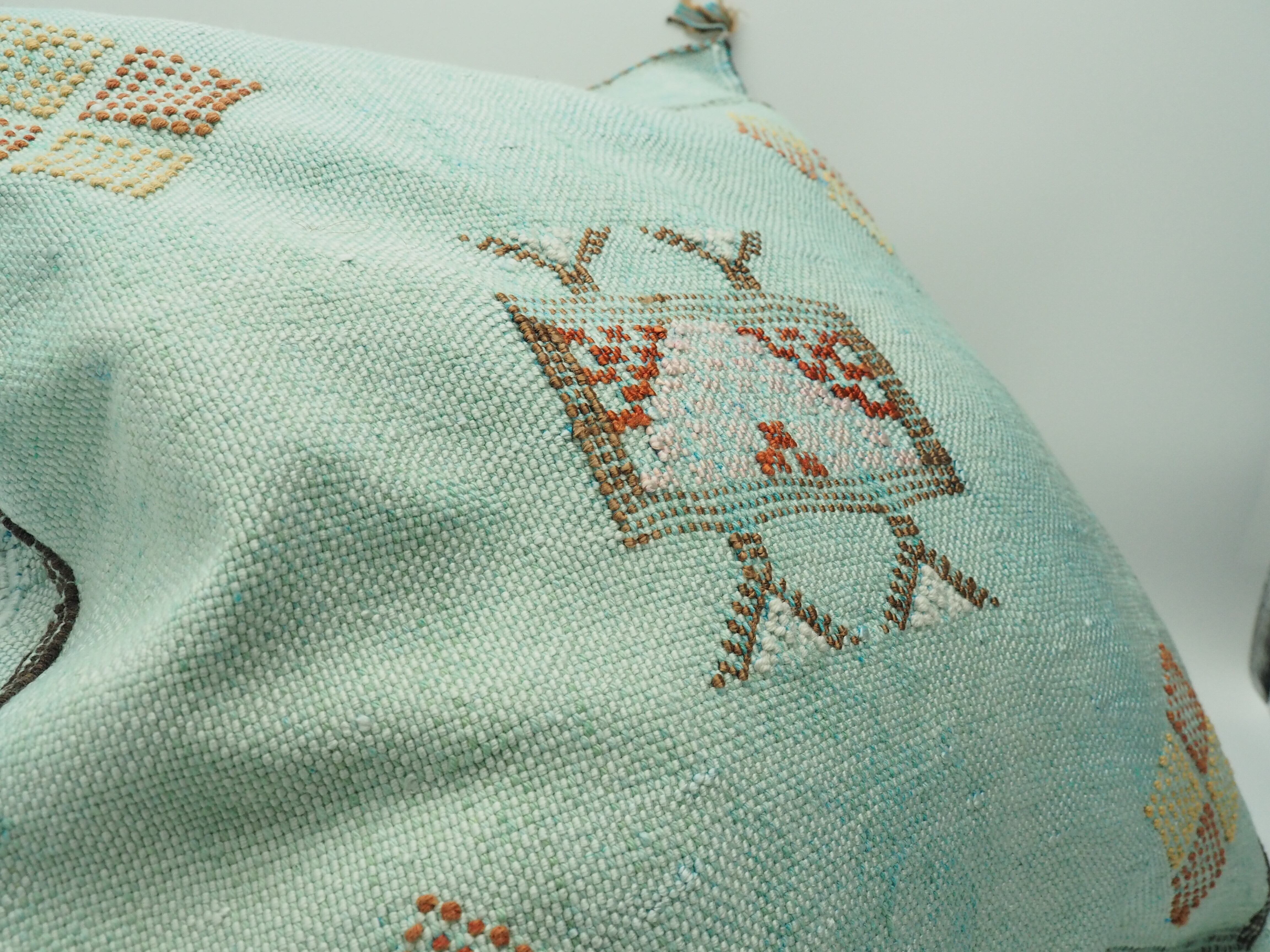 クッションカバーはベルベル民族の女性によってひとつひとつハンドメイドで作られており、ラグ同様に刺繍は制作者のインスピレーションによってデザインされています。
